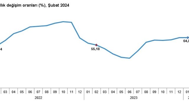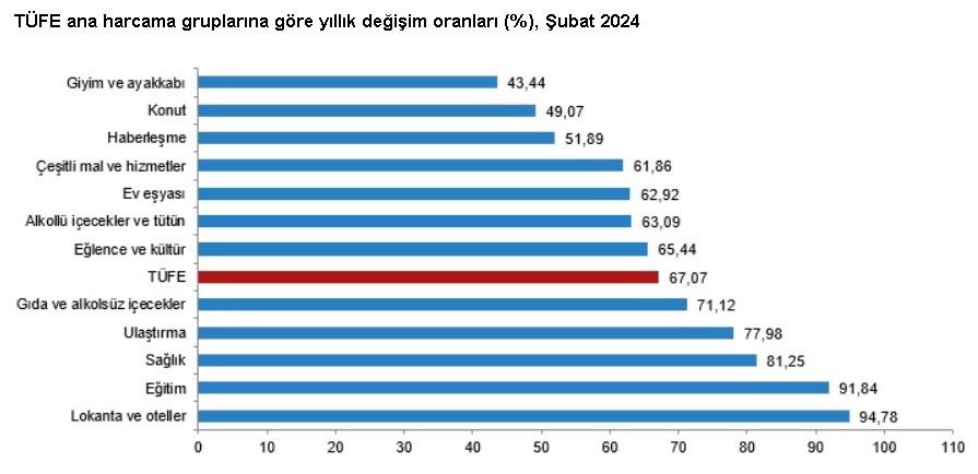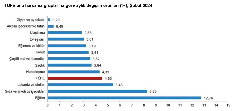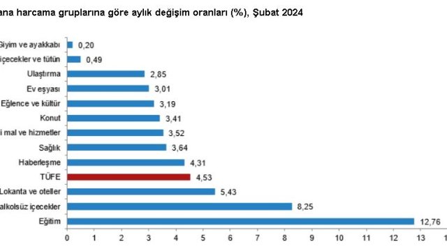 TÜİK, Şubat 2024 dönemine ilişkin tüketici ve yurt içi üretici enflasyon verilerini açıkladı. Buna göre; tüketici fiyatları şubat ayında bir önceki aya göre yüzde 4,53, bir önceki yılın aralık ayına göre yüzde 11,54, bir önceki yılın aynı ayına göre yüzde 67,07 ve 12 aylık ortalamalara göre yüzde 55,91 arttı. Bir önceki yılın aynı ayına göre en az fiyat artışı gösteren ana harcama grup, yüzde 43,44 ile giyim ve ayakkabı olurken; fiyat artışının en yüksek olduğu ana harcama grubu yüzde 94,78 ile lokanta ve oteller şeklinde gerçekleşti. Bir önceki aya göre en az artış fiyat artışı gösteren ana grubu yüzde 0,20 ile giyim ve ayakkabı, artışın en yüksek olduğu ana grup yüzde 12,76 ile eğitim oldu.