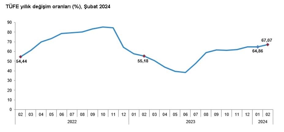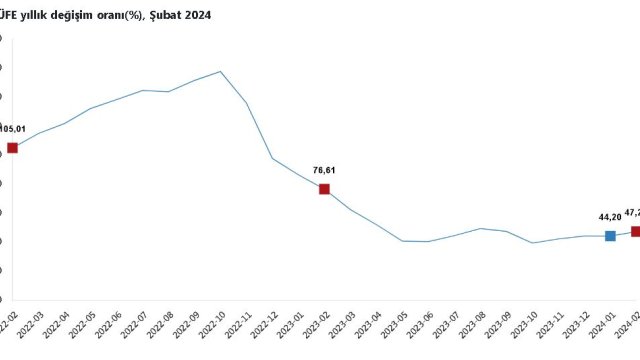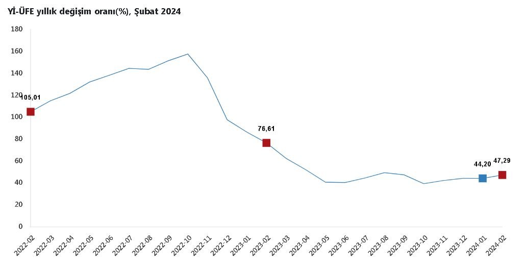 2024 yılı Şubat ayında yurt içi üretici fiyatları, bir önceki aya göre yüzde 3,74, bir önceki yılın aralık ayına göre yüzde 8,03, bir önceki yılın aynı ayına göre yüze 47,29 ve 12 aylık ortalamalara göre yüzde 45,71 arttı. Yurt içi üretici fiyatları, bir önceki yılın aynı ayına göre madencilik ve taş ocakçılığında yüzde 68,10 artış, imalatta yüzde 56,71 artış, elektrik, gaz üretimi ve dağıtımında yüzde 30,68 azalış ve su temininde yüzde 66,20 artış kaydetti. Ana sanayi gruplarında bir önceki yılın aynı ayına göre ara mallarında yüzde 51,47, dayanıklı tüketim mallarında yüzde 61,51, dayanıksız tüketim mallarında yüzde 64,34, enerjide yüzde 0,45 ve sermaye mallarında yüzde 64,70 fiyat artışı gerçekleşti.