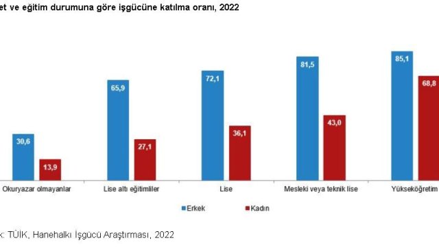 2022 yılında 15 ve daha yukarı yaştaki nüfusun iş gücüne katılma oranı yüzde 53,1 kaydedildi. Bu oran kadınlarda yüzde 35,1, erkeklerde ise yüzde 71,4 oldu. Kadınların eğitim seviyesi yükseldikçe iş gücüne daha fazla katıldıkları görüldü. Okuryazar olmayan kadınların iş gücüne katılma oranı yüzde 13,9, lise altı eğitimli kadınların iş gücüne katılma oranı yüzde 27,1, lise mezunu kadınların iş gücüne katılma oranı yüzde 36,1, mesleki veya teknik lise mezunu kadınların iş gücüne katılma oranı yüzde 43 iken, yükseköğretim mezunu kadınların iş gücüne katılma oranı yüzde 68,8 oldu.