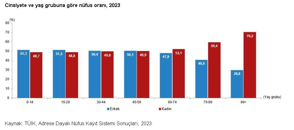 Türkiye İstatistik Kurumu, 'İstatistiklerle Kadın, 2023' bültenini yayımladı. Buna göre 31 Aralık 2023 tarihi itibarıyla, kadın nüfus 42 milyon 638 bin 306, erkek nüfus 42 milyon 734 bin 71 oldu. Toplam nüfusun yüzde 49,9'unu kadınlar, yüzde 50,1'ini erkekler oluşturdu. Kadınlar ile erkekler arasındaki oransal denge, kadınların daha uzun yaşaması nedeniyle, 60 ve daha yukarı yaş grubundan itibaren kadınların lehine değişti. Kadın nüfusun oranı, 60-74 yaş grubunda yüzde 52,1 iken 90 ve üzeri yaş grubunda yüzde 70,2 oldu.