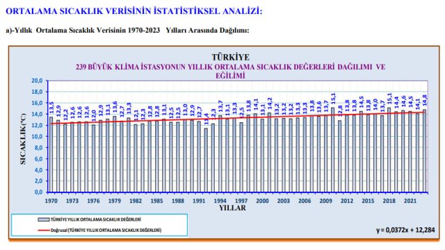 Meteoroloji Genel Müdürlüğü'nün 1970-2023 yılları arısındaki Türkiye Ortalama Sıcaklık raporunda, en sıcak ve en soğuk yıllardan, aylara göre en yüksek ve en düşük sıcaklıkların yaşandığı yıllar ile bölgelere ait veriler derlendi. Rapora göre, 2023 yılı, 53 yılın üçüncü en sıcak yılı oldu. 239 büyük klima istasyonunun yılık ortalama sıcaklık değerleri ortalamasına göre, Türkiye'de 2023 yılı ortalama sıcaklığı 14,8 derece ölçüldü.