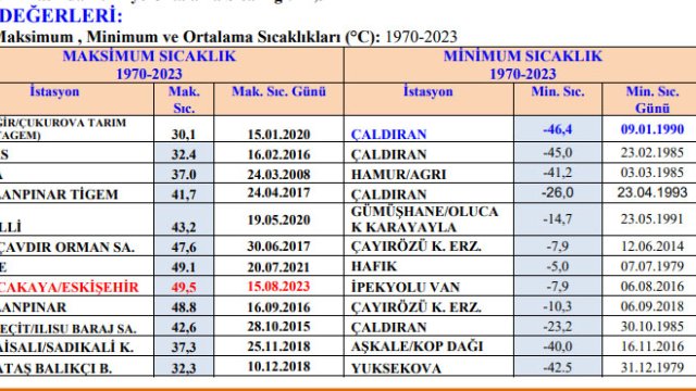 Meteoroloji Genel Müdürlüğü'nün 1970-2023 yılları ölçümlerine göre, 53 yılın sıcaklık rekoru 15 Ağustos 2023 günü 49,5 derece ile Eskişehir Sarıcakaya'da yaşanırken, en soğuk gün ise 9 Ocak 1990 günü Çaldıran'da eksi 46,4 derece olarak kayda geçti.