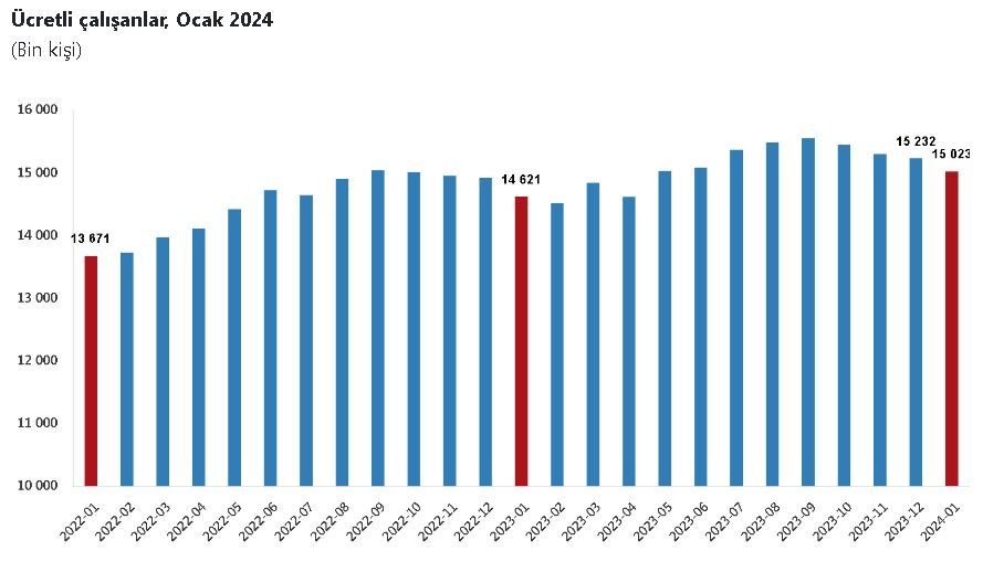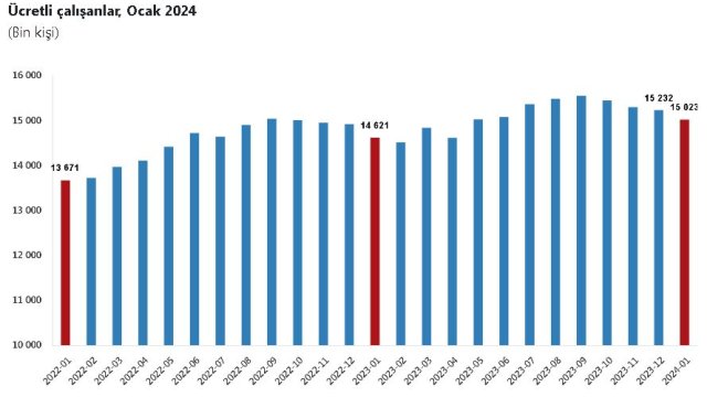 TÜİK, Ocak 2024 dönemine ilişkin ücretli çalışan istatistiklerini açıkladı. Buna göre; sanayi, inşaat ve ticaret-hizmet sektörleri toplamında ücretli çalışan sayısı 2024 Ocak ayında bir önceki yılın aynı ayına göre yüzde 2,8 arttı. Bir önceki yılın aynı ayında 14 milyon 620 bin 763 kişi olan ücretli çalışan sayısı, 2024 yılı Ocak ayında 15 milyon 22 bin 900 kişi oldu. Alt detaylarına bakıldığında, ocak ayında ücretli çalışan sayısı yıllık olarak sanayi sektöründe yüzde 0,1, inşaat sektöründe yüzde 9,6 ve ticaret-hizmet sektöründe yüzde 3,1 arttı.
