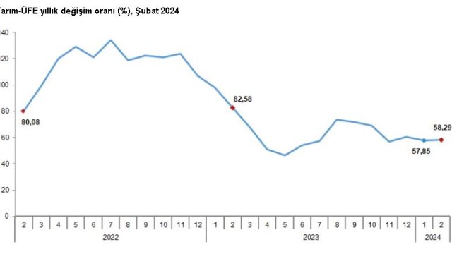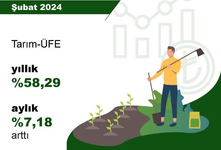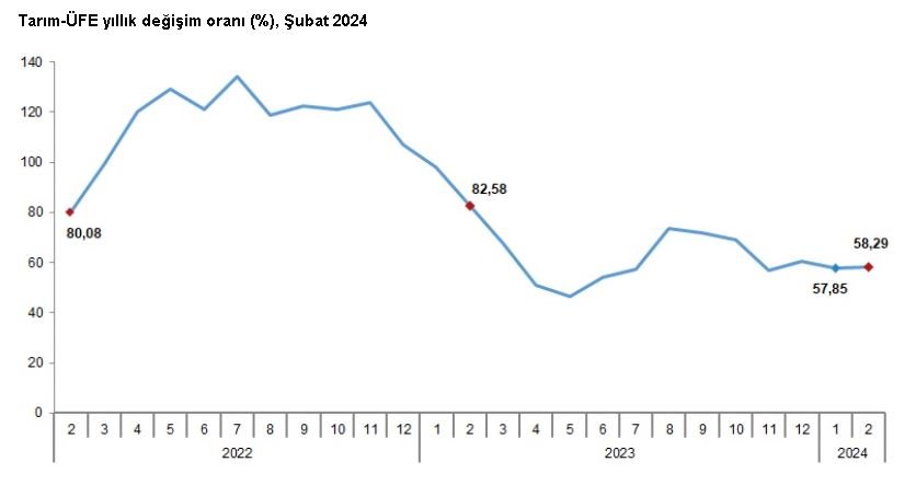 TÜİK, Şubat 2024 dönemine ilişkin tarım ürünleri üretici fiyat endeksi verilerini açıkladı. Buna göre; tarım ürünleri üretici fiyatları, şubat ayında bir önceki aya göre yüzde 7,18, bir önceki yılın aralık ayına göre yüzde 11,30, bir önceki yılın aynı ayına göre yüzde 58,29 ve 12 aylık ortalamalara göre yüzde 60,28 arttı. Sektörlerde bir önceki aya göre, tarım ve avcılık ürünleri ve ilgili hizmetlerde yüzde 7,28, ormancılık ürünleri ve ilgili hizmetlerde yüzde 5,25 ve balıkçılık ile destekleyici hizmetlerde yüzde 5,93 fiyat artışı gerçekleşti.