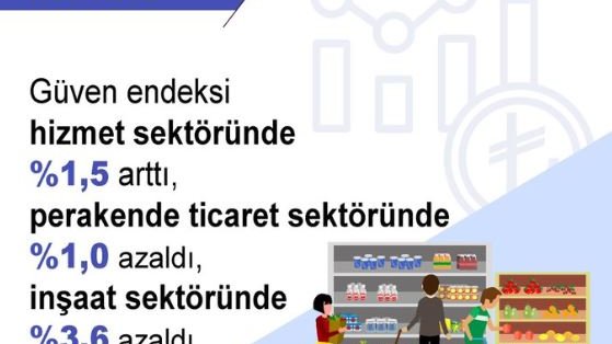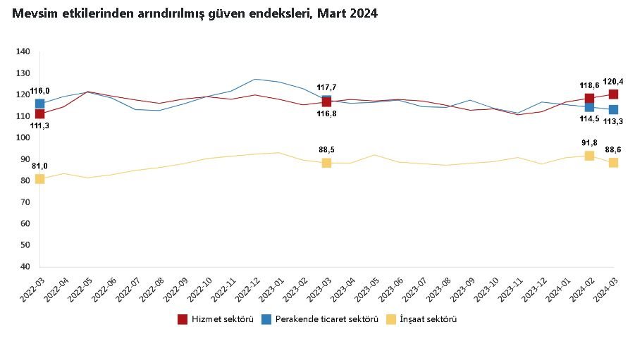 TÜİK, Mart 2024 dönemine ilişkin hizmet, perakende ticaret ve inşaat sektörleri güven endekslerini açıkladı. Buna göre; güven endeksi mart ayında bir önceki aya göre, hizmet sektöründe yüzde 1,5 oranında artarak 120,4 değerini, perakende ticaret sektöründe yüzde 1 azalarak 113,3 değerini ve inşaat sektöründe yüzde 3,6 azalarak 88,6 değerini aldı.