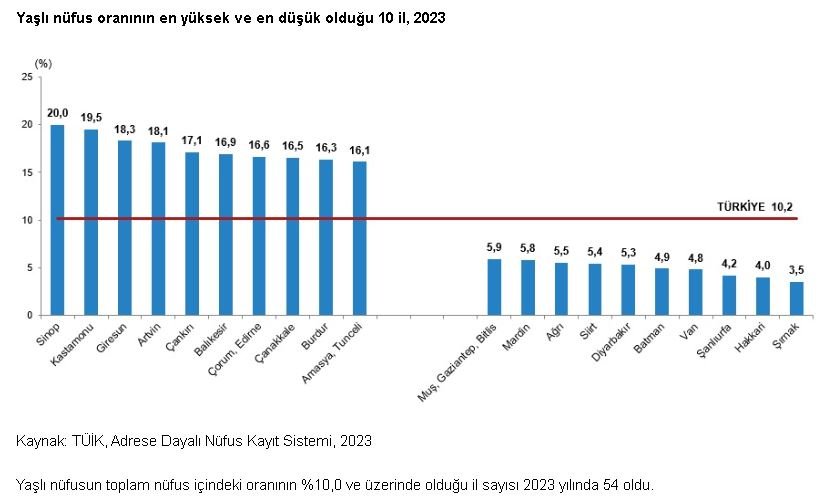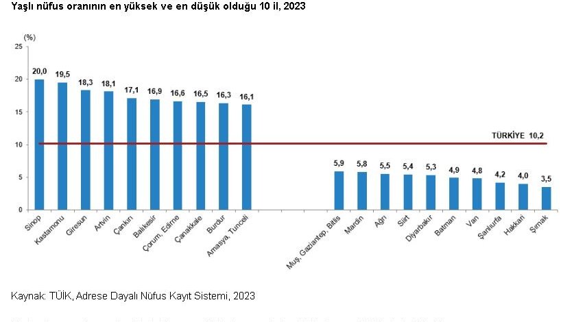 Yaşlı nüfus oranının en yüksek olduğu il, 2023 yılında yüzde 20 ile Sinop oldu. Bu ili yüzde 19,5 ile Kastamonu, yüzde 18,3 ile Giresun izledi. Yaşlı nüfus oranının en düşük olduğu il ise yüzde 3,5 ile Şırnak oldu. Bu ili yüzde 4 ile Hakkari, yüzde 4,2 ile Şanlıurfa izledi. Yaşlı nüfusun toplam nüfus içindeki oranının yüzde 10 ve üzerinde olduğu il sayısı 2023 yılında 54 oldu.
