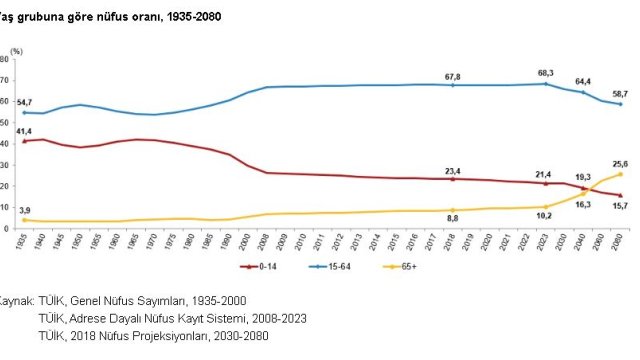 Çalışma çağındaki 100 kişiye düşen yaşlı sayısını ifade eden yaşlı bağımlılık oranı, 2018 yılında yüzde 12,9 iken; bu oran 2023 yılında yüzde 15'e yükseldi. Nüfus projeksiyonlarına göre, yaşlı bağımlılık oranının 2030 yılında yüzde 19,6, 2040 yılında yüzde 25,3, 2060 yılında yüzde 37,5 ve 2080 yılında yüzde 43,6 olacağı öngörüldü.