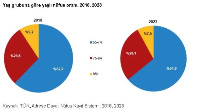 TÜİK, 'İstatistiklerle Yaşlılar, 2023' bültenini yayımladı. Buna göre; yaşlı nüfus olarak kabul edilen 65 ve daha yukarı yaştaki nüfus, 2018 yılında 7 milyon 186 bin 204 kişi iken son beş yılda yüzde 21,4 artarak 2023 yılında 8 milyon 722 bin 806 kişi oldu. Yaşlı nüfusun toplam nüfus içindeki oranı ise 2018 yılında yüzde 8,8 iken, 2023 yılında yüzde 10,2'ye yükseldi. Yaşlı nüfusun 2023 yılında yüzde 44,5'ini erkek nüfus, yüzde 55,5'ini kadın nüfus oluşturdu. Nüfus projeksiyonlarına göre, yaşlı nüfus oranının 2030 yılında yüzde 12,9, 2040 yılında yüzde 16,3, 2060 yılında yüzde 22,6 ve 2080 yılında yüzde 25,6 olacağı öngörüldü.