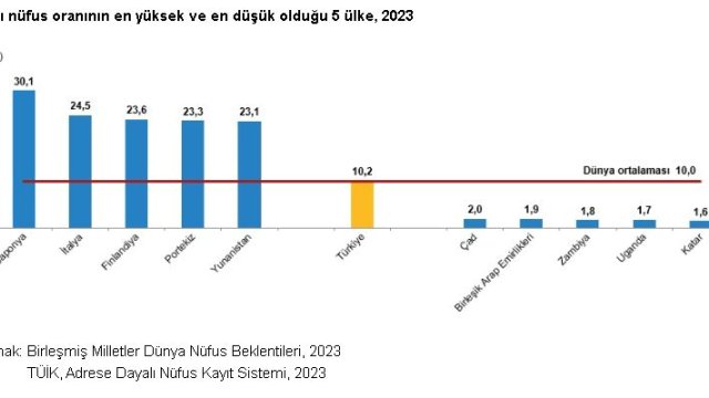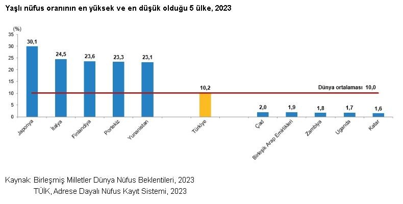 Birleşmiş Milletler dünya nüfus tahminlerine göre, 2023 yılı için dünya nüfusu 8 milyar 45 milyon 311 bin 448 kişi, yaşlı nüfusu ise 807 milyon 790 bin 294 kişi oldu. Buna göre, dünya nüfusunun yüzde 10'unu yaşlı nüfus oluşturdu. En yüksek yaşlı nüfus oranına sahip ilk üç ülke sırasıyla yüzde 30,1 ile Japonya, yüzde 24,5 ile İtalya ve yüzde 23,6 ile Finlandiya oldu. Türkiye, 184 ülke arasında 67'nci sırada yer aldı.