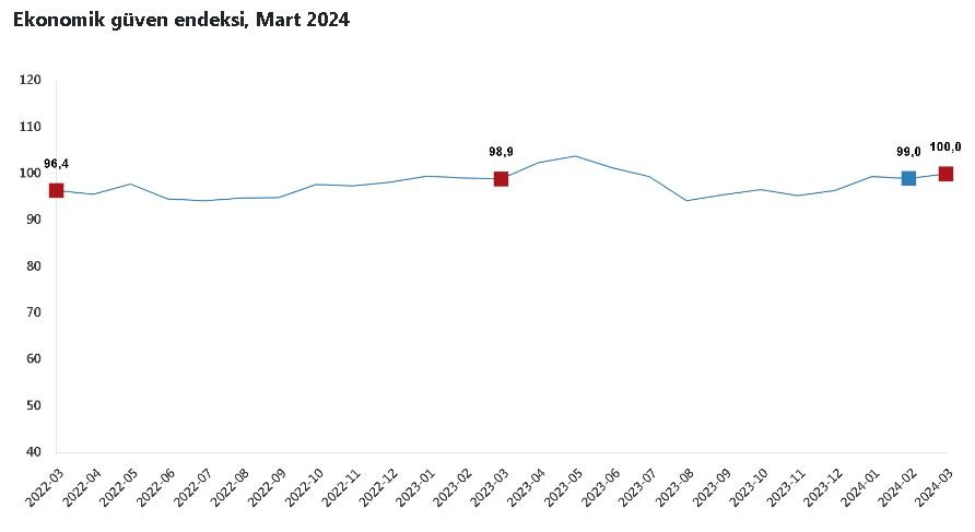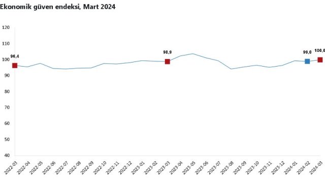 TÜİK, Mart 2024 dönemine ilişkin ekonomik güven endeksi verilerini açıkladı. Buna göre; şubay ayında 99 olan ekonomik güven endeksi, mart ayında yüzde 1 oranında artarak 100 değerini aldı. Bir önceki aya göre, tüketici güven endeksi yüzde 0,02 oranında artarak 79,4, reel kesim (imalat sanayi) güven endeksi yüzde 1,5 oranında artarak 103,5, hizmet sektörü güven endeksi yüzde 1,5 oranında artarak 120,4, perakende ticaret sektörü güven endeksi yüzde 1 oranında azalarak 113,3, inşaat sektörü güven endeksi yüzde 3,6 oranında azalarak 88,6 oldu.