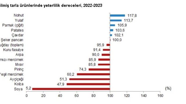 TÜİK, bitkisel ürün denge tablolarını açıkladı. Buna göre; tahıl ürünleri toplamı için 2022-2023 piyasa döneminde yeterlilik derecesi yüzde 92,3 olarak gerçekleşti. Toplam tahıl üretiminde en büyük paya sahip olan buğdayın yeterlilik derecesi yüzde 95,9 (durum buğdayında yüzde 181, diğer buğdayda yüzde 86,4), yem sanayinin en önemli girdilerini oluşturan arpanın yeterlilik derecesi yüzde 90, mısırın yeterlilik derecesi yüzde 85,8, soyanın yeterlilik derecesi ise yüzde 5,2 olarak gerçekleşti.