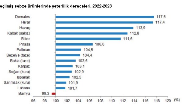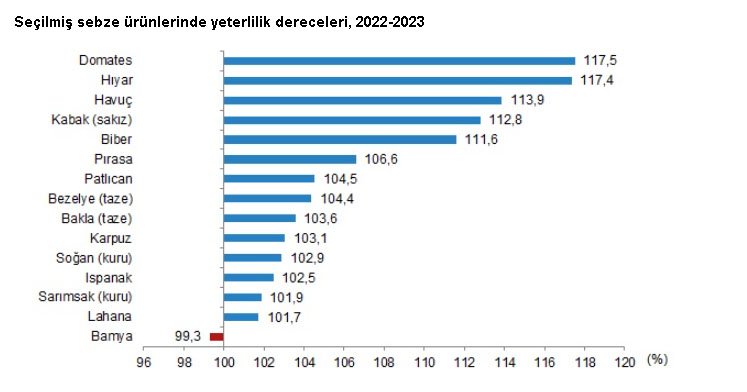 Sebze ürünleri toplamı için 2022-2023 piyasa döneminde yurt içi üretimin, yurt içi talebi karşılama derecesi yüzde 111,3 oldu. Sebzelerde en yüksek yeterlilik dereceleri domateste yüzde 117,5, hıyarda yüzde 117,4, havuçta ise yüzde 113,9 olarak gerçekleşti.
