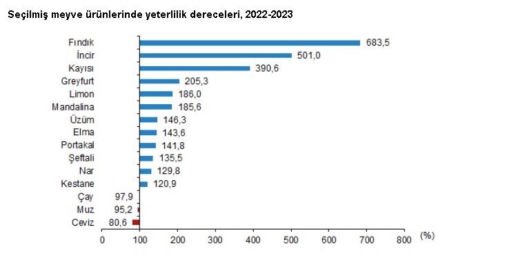 Meyveler ve içecek bitkilerinde 2022-2023 piyasa döneminde en yüksek yeterlilik derecesi yüzde 683,5 ile fındıkta gerçekleşti. Turunçgiller grubunda yer alan meyvelerin tamamının kendine yeterli olduğu görüldü. Toplam çay arzının büyük bir kısmı, Türkiye'nin kendi üretiminden karşılanırken; çayın yeterlilik derecesi yüzde 97,9 oldu.