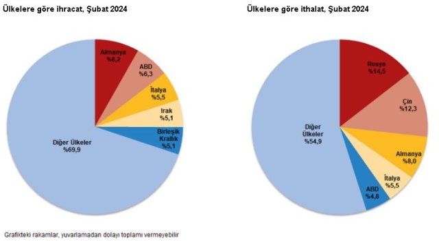 İthalatta Rusya Federasyonu ilk sırayı aldı. Şubat ayında Rusya Federasyonu'ndan yapılan ithalat 4 milyar 27 milyon dolar olurken, bu ülkeyi sırasıyla; 3 milyar 434 milyon dolar ile Çin, 2 milyar 218 milyon dolar ile Almanya, 1 milyar 543 milyon dolar ile İtalya, 1 milyar 337 milyon dolar ile ABD izledi. İlk 5 ülkeden yapılan ithalat, toplam ithalatın yüzde 45,1'ini oluşturdu. Ocak-şubat döneminde de ithalatta ilk sırayı Rusya Federasyonu aldı. Rusya Federasyonu'ndan yapılan ithalat 8 milyar 352 milyon dolar olurken, bu ülkeyi sırasıyla; 6 milyar 327 milyon dolar ile Çin, 4 milyar 135 milyon dolar ile Almanya, 2 milyar 739 milyon dolar ile ABD, 2 milyar 730 milyon dolar ile İtalya izledi. İlk 5 ülkeden yapılan ithalat, toplam ithalatın yüzde 44,9'unu oluşturdu.