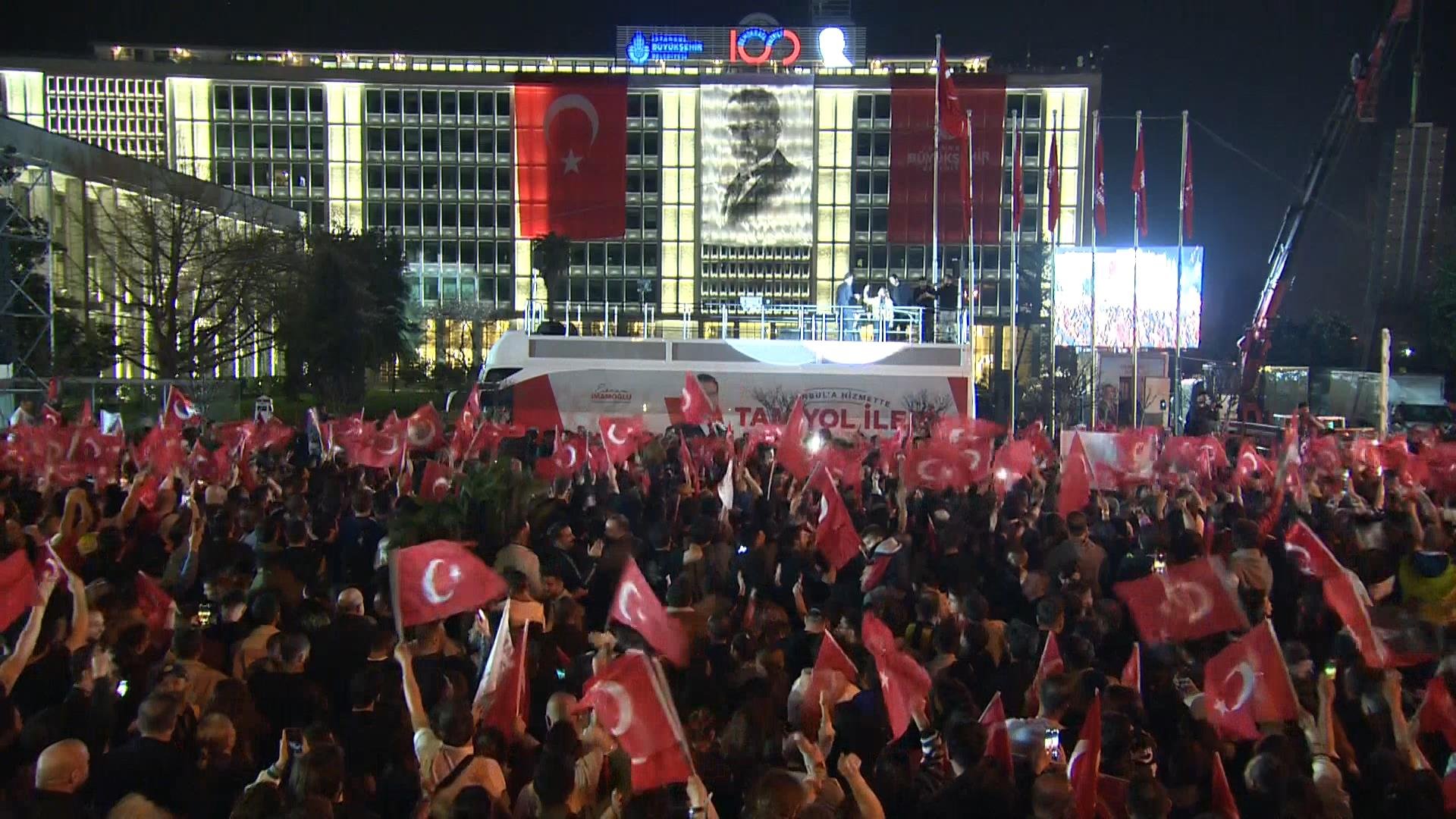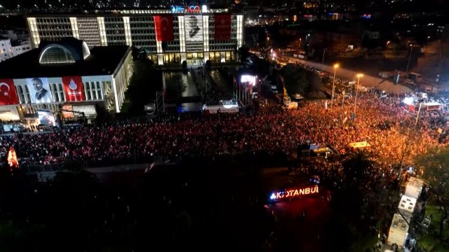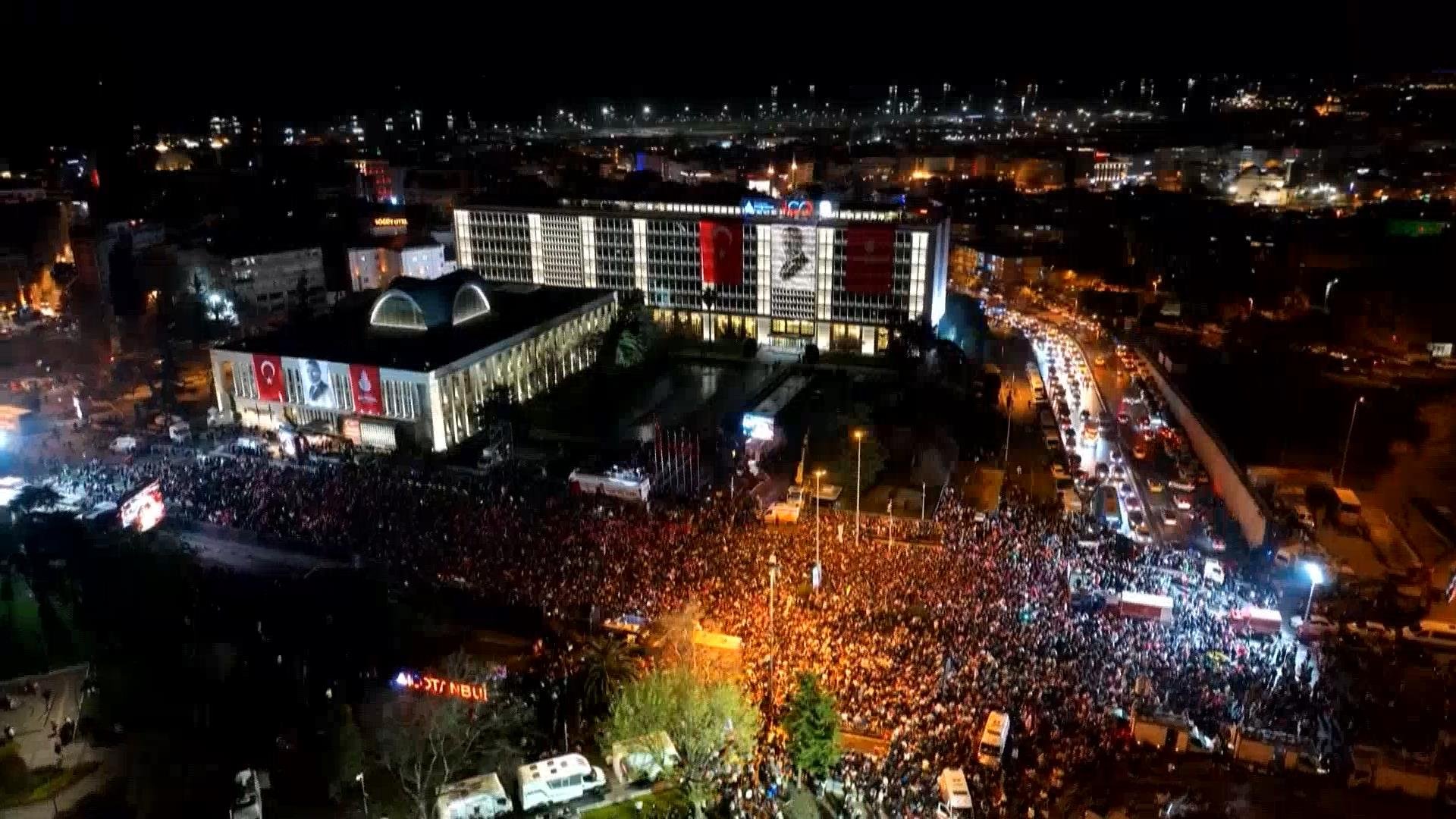 Mahalli İdareler Genel Seçimleri'nde gayri resmi sonuçlara göre, İstanbul'da İBB Başkanlığı'nı Ekrem İmamoğlu yeniden kazandı. İmamoğlu'nu destekleyenler akşam saatlerinden itibaren Saraçhane'de İBB Başkanlık binası önünde toplanmaya başladı. İmamoğlu da CHP İstanbul İl Başkanlığı'ndaki açıklamalarından sonra Saraçhane'ye geldi. CHP Beyoğlu Belediye Başkan Adayı İnan Güney ve CHP Bakırköy Belediye Başkan Adayı Ayşegül Ovalıoğlu da Saraçhane'de İmamoğlu'na eşlik etti. İmamoğlu, alanda konuşma gerçekleştirdi.
