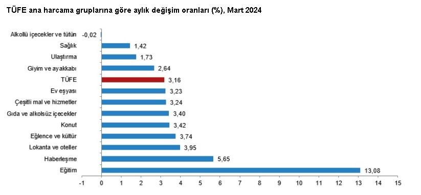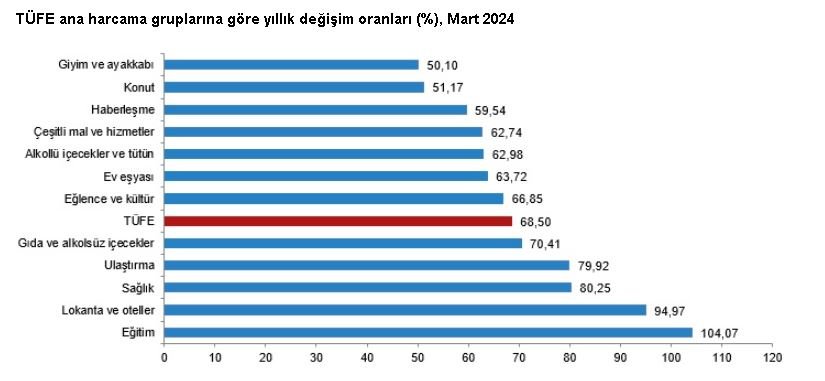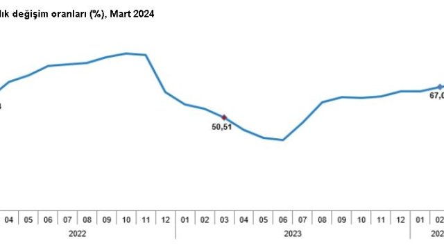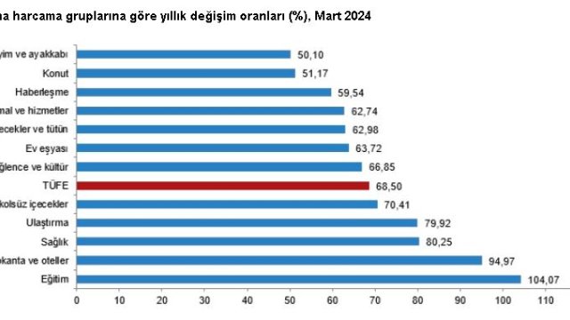 TÜİK, Mart 2024 dönemine ilişkin enflasyon verilerini açıkladı. Buna göre; tüketici fiyatları mart ayında bir önceki aya göre yüzde 3,16, bir önceki yılın aralık ayına göre yüzde 15,06, bir önceki yılın aynı ayına göre yüzde 68,50 ve 12 aylık ortalamalara göre yüzde 57,50 arttı. Bir önceki yılın aynı ayına göre, en az fiyat artışı görülen ana harcama grubu yüzde 50,10 ile giyim ve ayakkabı olurken; fiyat artışının en yüksek olduğu ana grup ise yüzde 104,07 ile eğitim oldu. Mart ayında bir önceki aya göre fiyat azalışı gösteren tek ana harcama grubu yüzde 0,02 ile alkollü içecekler ve tütün oldu. Buna karşılık, bir önceki aya göre artışın en yüksek olduğu ana grup ise yüzde 13,08 ile eğitim oldu.