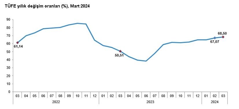 2024 yılı mart ayında yurt içi üretici fiyatları bir önceki aya göre yüzde 3,29, bir önceki yılın aralık ayına göre yüzde 11,59, bir önceki yılın aynı ayına göre yüzde 51,47 ve 12 aylık ortalamalara göre yüzde 45,28 artış gösterdi.
