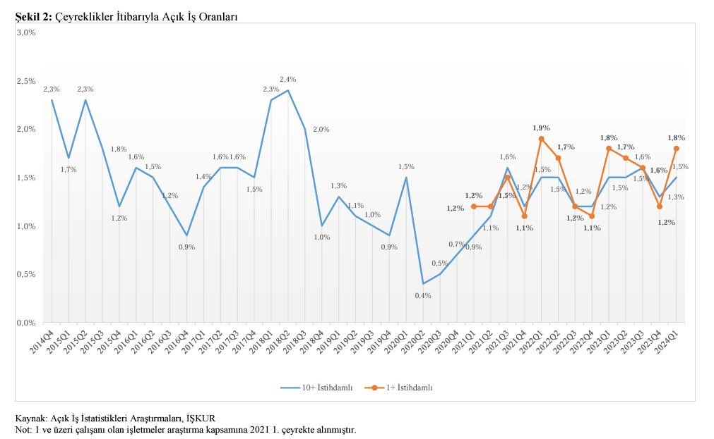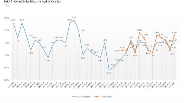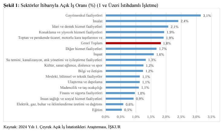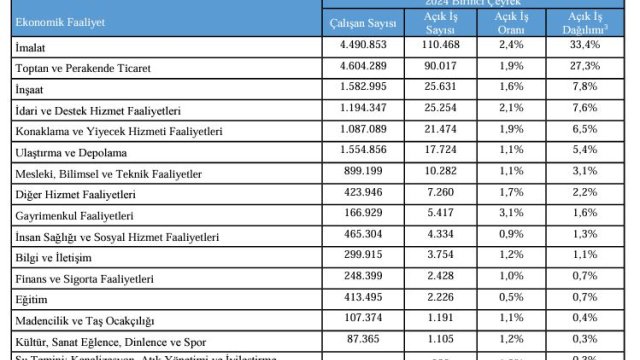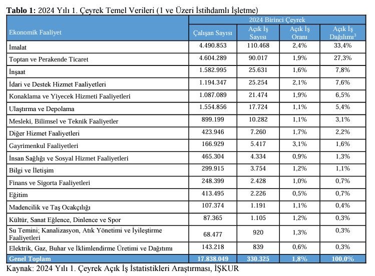 Türkiye genelinde 1 ve daha fazla kişi istihdam eden işletmelerde en fazla açık iş 110 bin 468 ile imalat sektöründe olurken; tüm açık işlerin yüzde 33,4'ü bu sektörde yer aldı. İmalat sektöründen sonra en fazla açık iş, sırasıyla toptan ve perakende ticaret ile inşaat sektörlerinde. Toptan ve perakende ticaret sektöründe 90 bin 17 kişilik, inşaat sektöründe ise 25 bin 631 kişilik açık iş tespit edildi. 2024 yılı 1'inci çeyreği itibarıyla Türkiye genelindeki açık işlerin yüzde 68,5'i imalat, toptan ve perakende ticaret ile inşaat sektörlerinde. 2024 yılı 1'inci çeyreğinde Türkiye genelinde 1 ve daha fazla kişi istihdam eden işletmelerde açık iş oranı yüzde 1,8 olarak gerçekleşti. Bununla birlikte, 1-9 çalışanı olan işletmelerde ise açık iş oranı yüzde 2,4 olarak gerçekleşti. Diğer taraftan, 2024 yılı birinci çeyreğinde Türkiye genelinde 10 ve daha fazla kişi istihdam eden işletmelerde açık iş oranı, bir önceki yılın aynı dönemindeki oranını korudu ve yüzde 1,5 olarak gerçekleşti.
