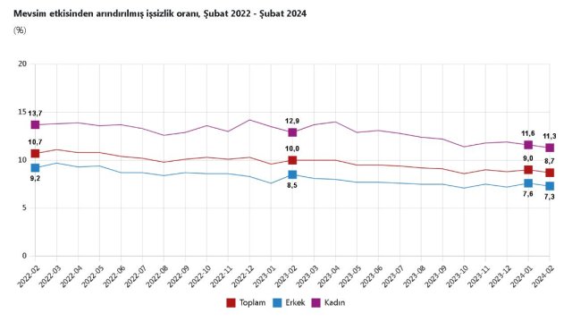 TÜİK, Şubat 2024 dönemine ilişkin iş gücü istatistiklerini açıkladı. Buna göre; 15 ve daha yukarı yaştaki kişilerde işsiz sayısı şubat ayında bir önceki aya göre 109 bin kişi azalarak 3 milyon 78 bin kişi oldu. İşsizlik oranı da 0,3 puan azalarak yüzde 8,7 seviyesinde gerçekleşti. İşsizlik oranı erkeklerde yüzde 7,3, kadınlarda yüzde 11,3 oldu.