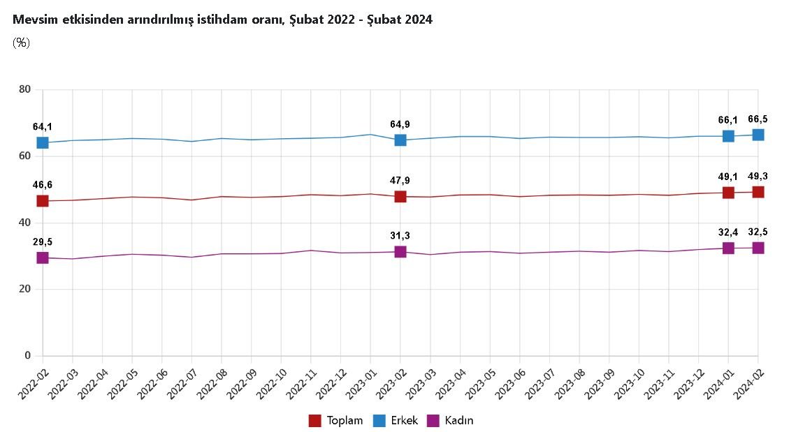 İstihdam edilenlerin sayısı, 2024 yılı Şubat ayında bir önceki aya göre 147 bin kişi artarak 32 milyon 423 bin kişi, istihdam oranı 0,2 puan artarak yüzde 49,3 oldu. Bu oran erkeklerde yüzde 66,5, kadınlarda yüzde 32,5 kaydedildi. İş gücü şubat ayında bir önceki aya göre 38 bin kişi artarak 35 milyon 501 bin kişi, iş gücüne katılma oranı aynı seviyede kalarak yüzde 54 olarak gerçekleşti. İş gücüne katılma oranı erkeklerde yüzde 71,7, kadınlarda yüzde 36,6 oldu. 15-24 yaş grubunu kapsayan genç nüfusta işsizlik oranı, bir önceki aya göre 0,8 puan azalarak yüzde 15,6 oldu. Bu yaş grubunda işsizlik oranı, erkeklerde yüzde 13,4, kadınlarda yüzde 19,6 olarak gerçekleşti.