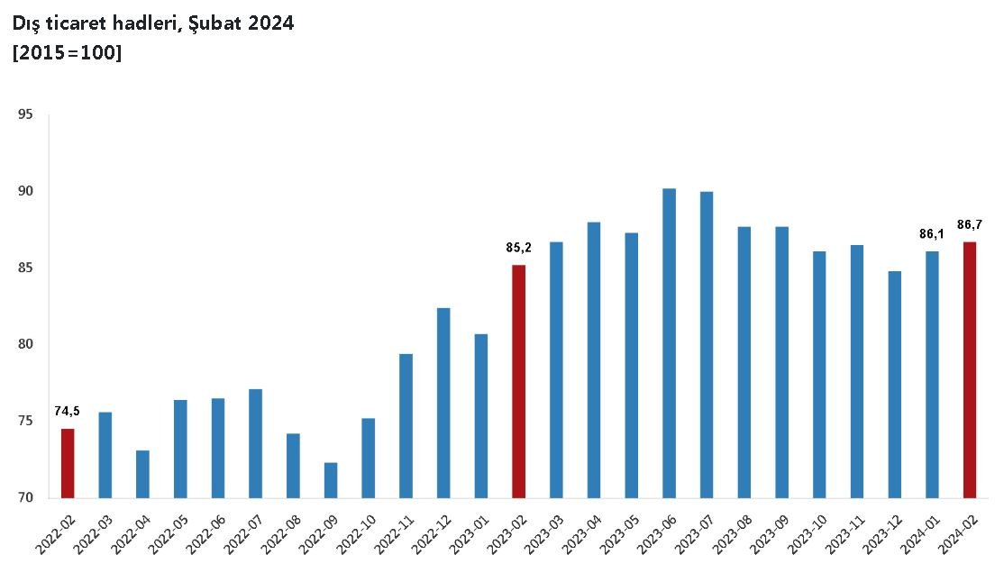 İhracat birim değer endeksinin ithalat birim değer endeksine bölünmesiyle hesaplanan ve 2023 yılı Şubat ayında 85,2 olarak elde edilmiş olan dış ticaret haddi, 1,5 puan artarak 2024 yılı Şubat ayında 86,7 oldu.