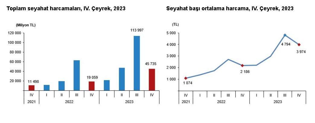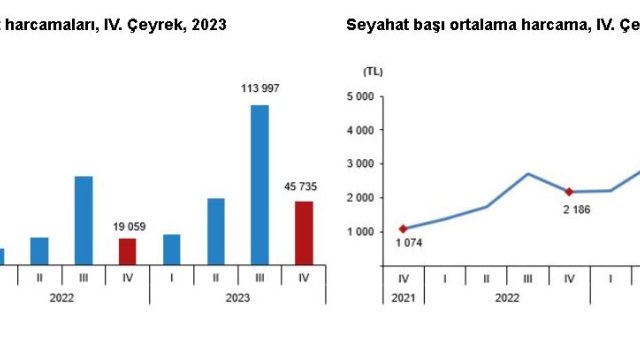 Yerli turistlerin, yurt içinde yaptıkları seyahat harcamaları 2023 yılının 4'üncü çeyreğinde bir önceki yılın aynı çeyreğine göre yüzde 140 artarak 45 milyar 734 milyon 935 bin lira olarak gerçekleşti. Bu harcamaların yüzde 93'ünü 42 milyar 526 milyon 11 bin lira ile kişisel harcamalar, yüzde 7'sini ise 3 milyar 208 milyon 924 bin lira ile paket tur harcamaları oluşturdu. Seyahat başına yapılan ortalama harcama ise 3 bin 974 lira oldu.