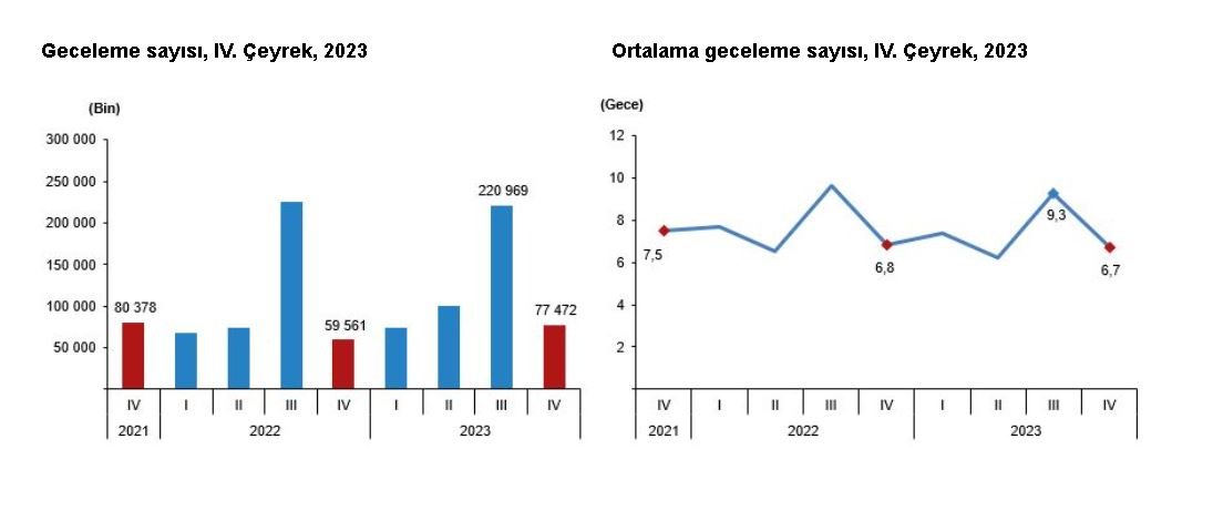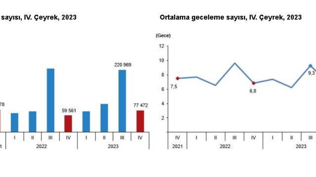 TÜİK, 2023'ün 4'üncü çeyreğine ilişkin hanehalkı yurt içi turizm verilerini açıkladı. Buna göre; ekim, kasım ve aralık aylarından oluşan 4'üncü çeyrekte, yurt içinde ikamet eden 9 milyon 616 bin kişi seyahate çıktı. Seyahate çıkanların bir ve daha fazla geceleme kaydı ile ülke içinde yaptıkları toplam seyahat sayısı, bir önceki yılın aynı çeyreğine göre yüzde 32 artarak 11 milyon 509 bin seyahat olarak gerçekleşti. Bu çeyrekte seyahate çıkanlar 77 milyon 472 bin geceleme yaptı. Ortalama geceleme sayısı 6,7 gece oldu.