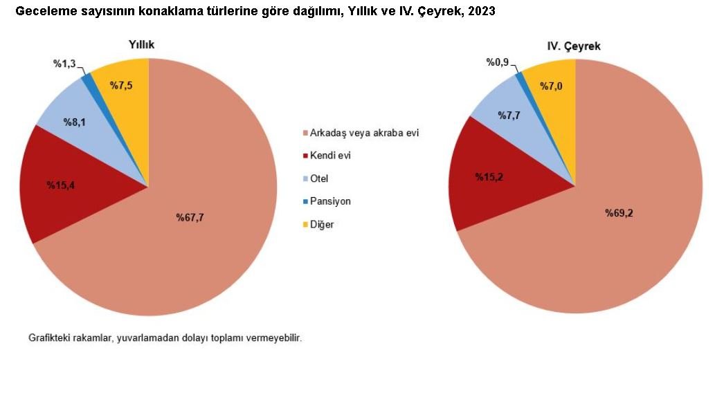 Konaklama türleri yıllık olarak değerlendirildiğinde, seyahate çıkanlar 320 milyon 410 bin geceleme sayısı ile en çok arkadaş veya akraba evinde kaldı. İkinci sırada 72 milyon 620 bin geceleme ile kendi evi yer alırken; otel 38 milyon 263 bin geceleme sayısı ile üçüncü sırada yer aldı.