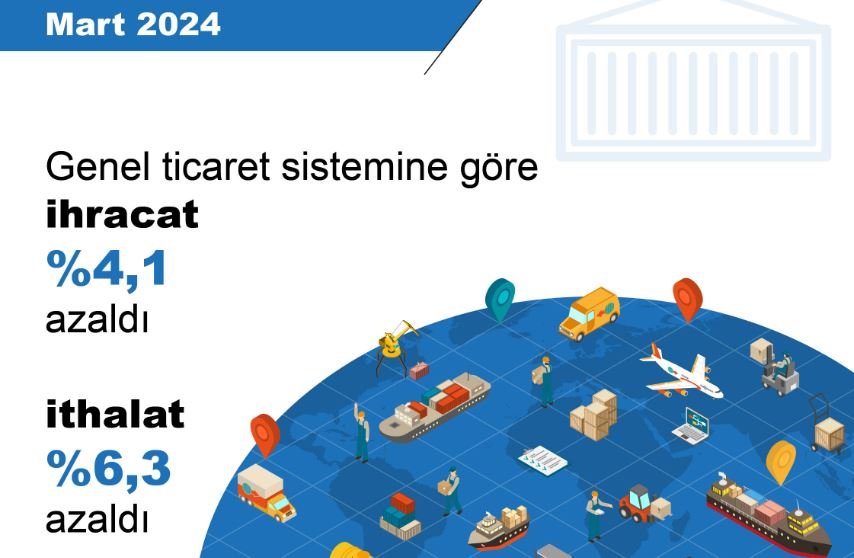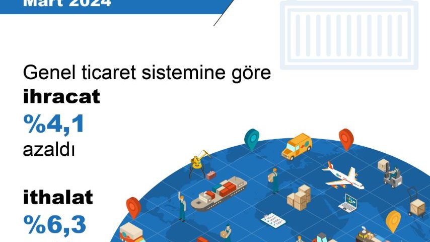 TÜİK, Mart 2024 dönemine ilişkin dış ticaret istatistiklerini açıkladı. Buna göre; ihracat 2024 yılı Mart ayında, bir önceki yılın aynı ayına göre yüzde 4,1 azalarak 22 milyar 571 milyon dolar, ithalat yüzde 6,3 azalarak 29 milyar 912 milyon dolar olarak gerçekleşti. 2024 Ocak-Mart döneminde ise ihracat bir önceki yılın aynı dönemine göre yüzde 3,6 artarak 63 milyar 603 milyon dolar, ithalat yüzde 12,8 azalarak 83 milyar 945 milyon dolar olarak gerçekleşti.