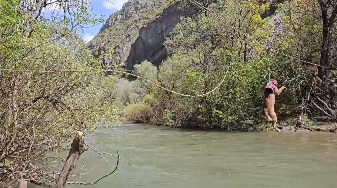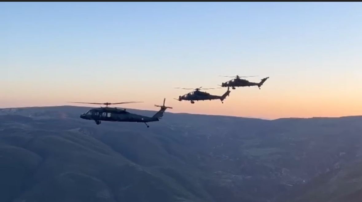 Operasyon sırasında iz bulma köpeklerinin halatlarla debisi yüksek nehirden geçirilmesi, taarruz helikopterlerinin şüpheli alanları taraması ise kameraya yansıdı.