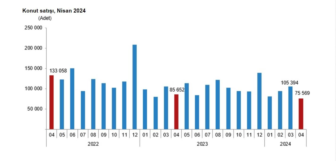 TÜİK, Nisan 2024 dönemine ilişkin konut satış istatistiklerini açıkladı. Buna göre; Türkiye genelinde konut satış sayısı, nisan ayında bir önceki yılın aynı ayına göre yüzde 11,8 azalarak 75 bin 569 oldu. Konut satış sayısının en fazla olduğu iller sırasıyla 12 bin 406 ile İstanbul, 6 bin 272 ile Ankara ve 4 bin 427 ile Antalya olurken, en az olduğu iller sırasıyla 18 ile Ardahan, 35 ile Hakkari ve 49 ile Tunceli oldu.