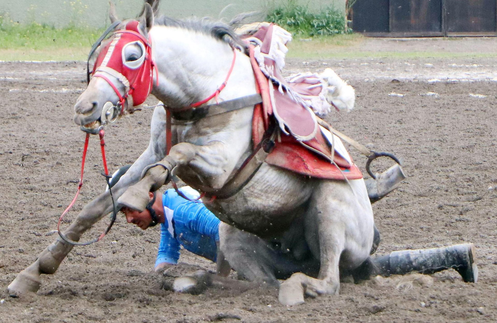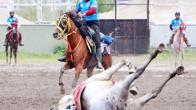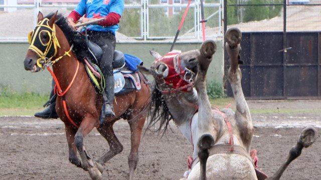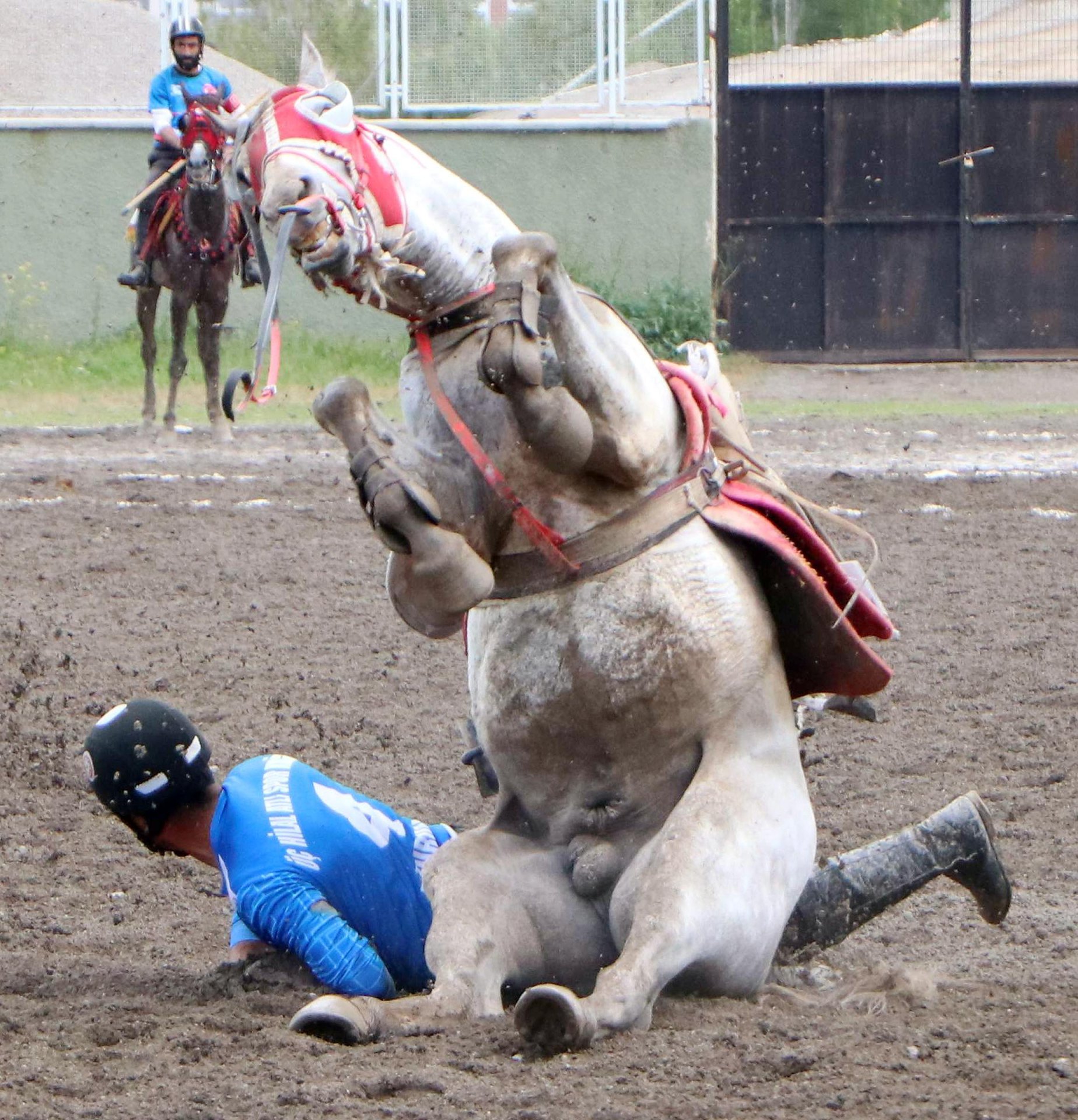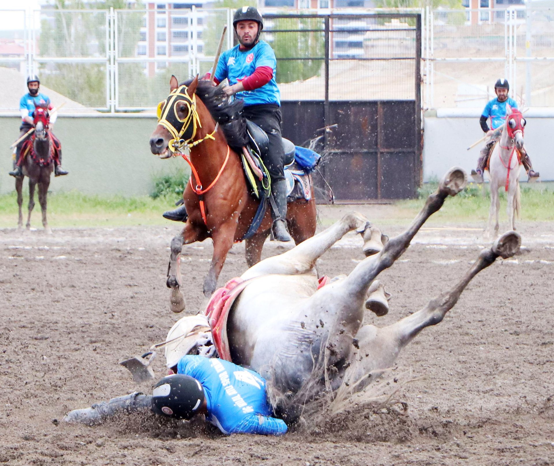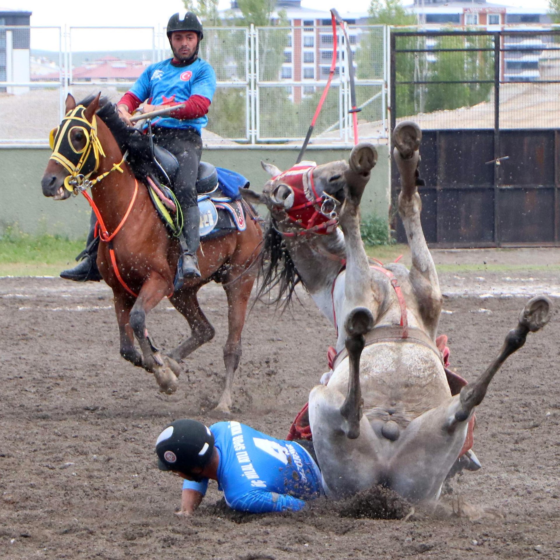 Merkez Yakutiye ilçesindeki cirit sahasında düzenlenen birinci lig maçında Ay Yıldız Atlı Cirit Kulübü ile Üç Hilal Atlı Cirit Spor Kulübü karşı karşıya geldi. Seyircilerin yoğun ilgi gösterdiği mücadelenin ikinci yarısı oynanırken yürekleri ağızlara getiren bir kaza yaşandı. Ay Yıldız Atlı Spor Kulübü oyuncusu İsmail Yıldırım, rakip sahaya gidip ciridi attıktan sonra geri dönerken dört nala sürdüğü atının ayağı takıldı. Yıldırım, atıyla birlikte düşüp, takla attı. Sahadaki tüm sporcularla sağlık ekipleri, Yıldırım’ın yardımına koştu. Yapılan sağlık kontrolünden durumunun iyi olduğu belirlenen İsmail Yıldırım, çamur olan elini ve yüzünü yıkadıktan sonra seyircilerin alkışları arasında tekrar atına binip, müsabakaya devam etti. Çekişmeli geçen müsabakayı Üç Hilal Atlı Cirit Spor Kulübü kazandı.