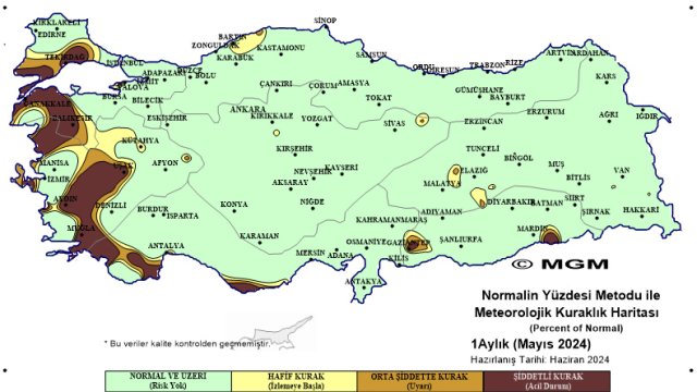 Meteoroloji Genel Müdürlüğü'nün mayıs ayı sıcaklık ve yağış raporları ve meteorolojik kuraklık haritalarına göre sıcaklığın normaline göre düştüğü, yağışların arttığı ve kuraklık haritasında da Türkiye'de son yılların en yeşil görüntüsü oluştu. Raporlara göre, mayıs ayında sıcaklık Kırklareli, Antakya, Karabük, Boyabat, Kızılcahamam, İspir, Doğubeyazıt çevrelerinde mevsim normallerinin altında yaşandı. Kuşadası, Aydın, Bodrum, Datça, Marmaris, Seferihisar, Isparta, Fethiye, Alanya, Anamur, Kaş, Senirkent, Eğirdir, Acıpayam, Köyceğiz, Manavgat, Kale-Demre, Gazipaşa ve Ceylanpınar çevrelerinde ise mevsim normallerinin üzerinde gerçekleşti.