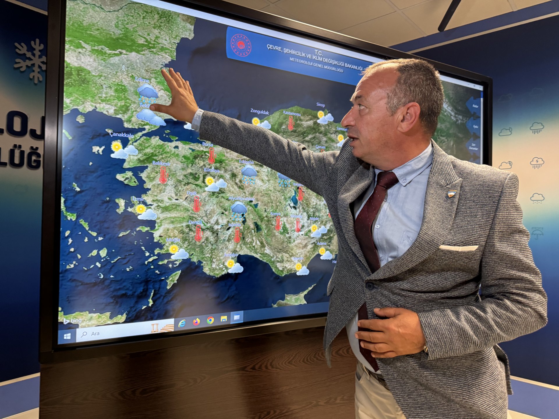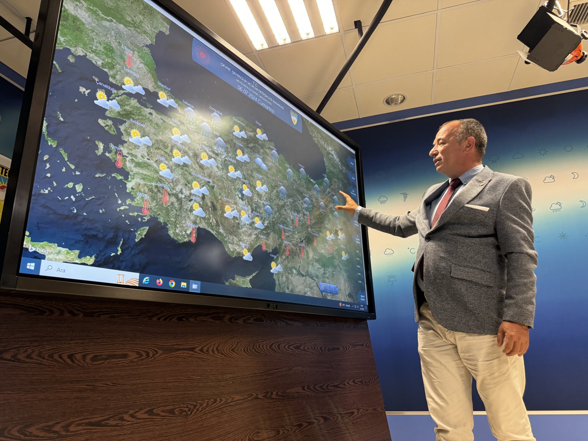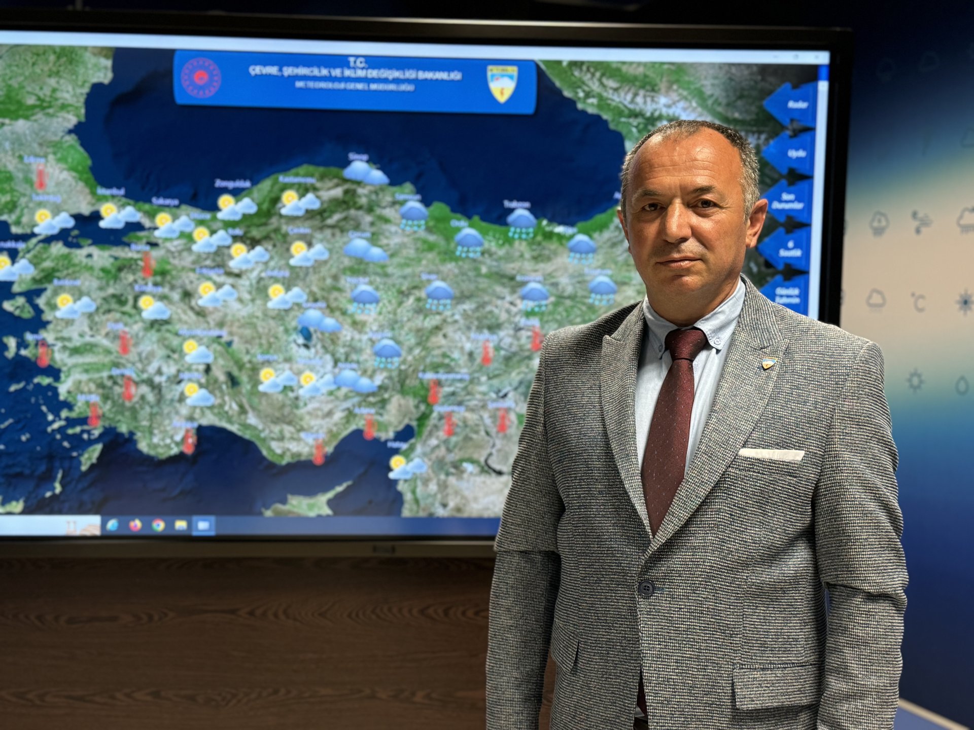 Yavuz, Ankara'da hava sıcaklığının 36 derece seviyesinde olduğunu aktararak, "Hava sıcaklığı perşembe günü 34 dereceye, cuma günü ise 28 dereceye düşecek; fakat hafta sonu tekrar artmasını bekliyoruz. 1 günlük bir serinleme akabinde tekrardan 30 derecenin üzerinde sıcaklıkların görülmesini beklemekteyiz, ülke genelinde. Yurdumuzun batı kesimlerinde çarşamba ve perşembe günü güneyli rüzgarların etkili olmasını bekliyoruz. Perşembe günü için batı bölgelerde hafif bir toz taşınımı görülme ihtimali var. Fazla olmamakla birlikte yine havada hafif bulanıklık görebiliriz. Yer yer hafiften çamur gibi yağışların yağma ihtimali var. Fakat etkili bir toz taşınımı beklemiyoruz" şeklinde konuştu.