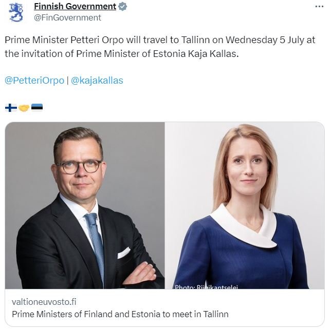 Finlandiya Hükümeti tarafından yapılan yazılı açıklamada, Finlandiya Başbakanı Petteri Orpo’nun, Estonya Başbakanı Kaja Kallas’ın davetlisi olarak 5 Temmuz’da başkent Tallin’e bir ziyaret gerçekleştireceği belirtildi. Orpo ve Kallas’ın, iki ülke arasındaki ilişkileri, Baltık Denizi bölgesinin güvenliğini, Avrupa Birliği (AB) ile ilgili güncel konuları ve uluslararası meseleleri ele alacakları ifade edildi. Ziyareti sırasında Orpo’nun, Estonya Cumhurbaşkanı Alar Karis ile de görüşeceği belirtildi.