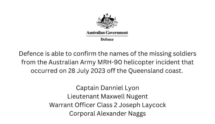 Avustralya Başbakan Yardımcısı ve Savunma Bakanı Richard Marles, 28 Temmuz’da Queensland eyaleti yakınlarında ABD-Avustralya ortak askeri tatbikatı sırasında düşen Avustralya ordusuna ait MRH-90 Taipan tipi helikopterde bulunan 4 mürettebata yönelik arama kurtarma çalışmalarına ilişkin basına açıklamalarda bulundu.