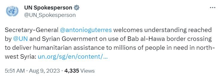 “Genel Sekreter, Kuzey Batı Suriye’de ihtiyaç sahibi milyonlarca kişiye hayat kurtaran insani yardım sağlamak için Bab al-Hawa sınır kapısının önümüzdeki altı ay boyunca kullanılmaya devam edilmesi konusunda Birleşmiş Milletler ve Suriye Hükümeti tarafından dün varılan mutabakatı memnuniyetle karşılıyor.”