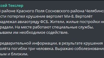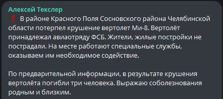 Çelyabinsk Bölge Valisi Aleksey Teksler, resmi Telegram hesabından yaptığı açıklamada, “Çelyabinsk’in Sosnovsky bölgesindeki Krasnoye Poly yakınlarında bir Mi-8 tipi helikopter düştü. Helikopter, FSB’ye aitti. Bölge sakinlerinden yaralanan olmadı ve yerleşim yerlerinde hasar görülmedi. Özel servisler bölgede çalışıyor, onlara gerekli yardımı sağlıyoruz. İlk bilgilere göre helikopter kazasında 3 kişi hayatını kaybetti. Ailelerine ve sevdiklerine başsağlığı dileklerimi iletiyorum” dedi.