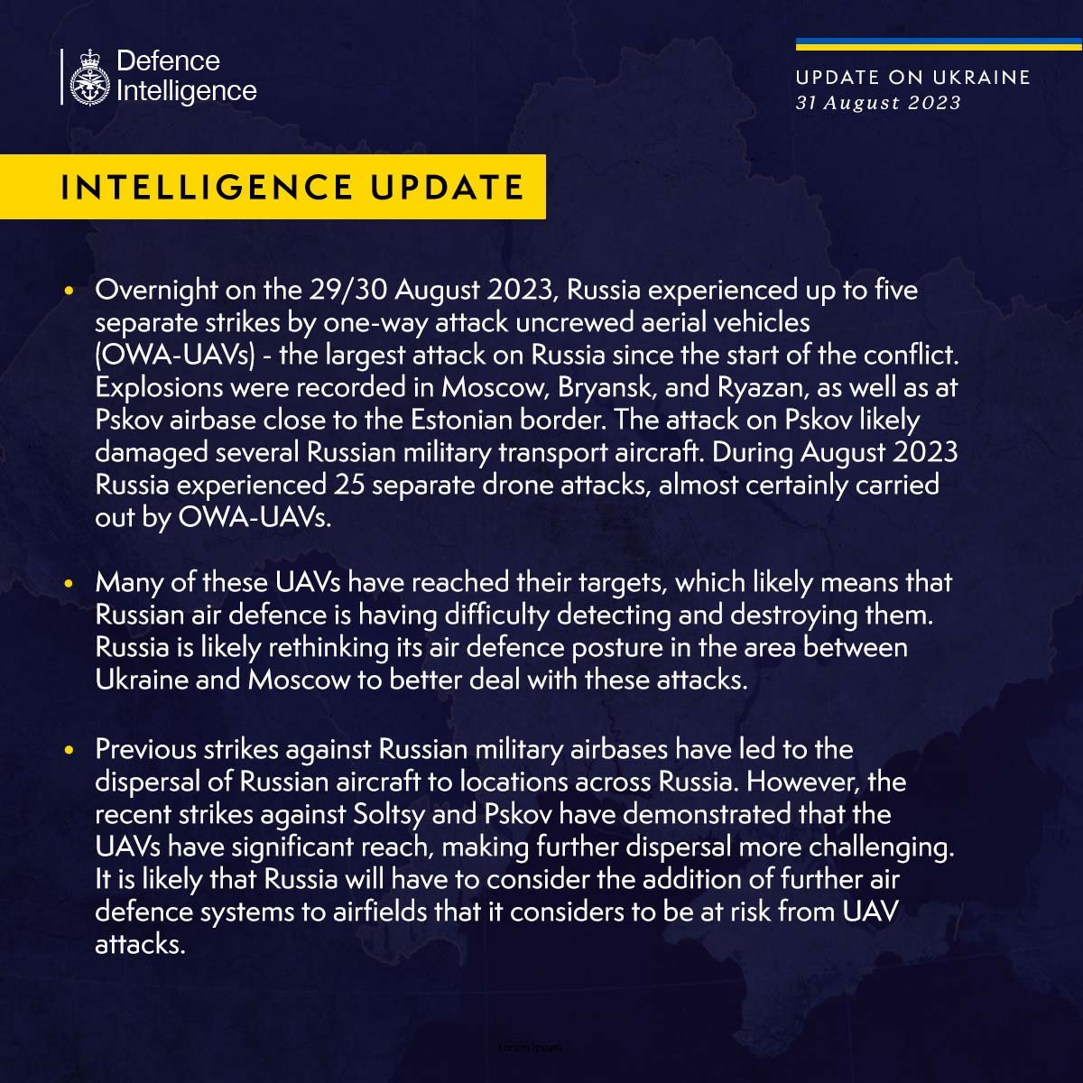 İngiltere Savunma Bakanlığı istihbarat raporunda, 29 Ağustos’u 30 Ağustos’a bağlayan gece Ukrayna’nın Rusya’ya 5 farklı İHA saldırı düzenlediği, saldırılar sonucu Moskova, Bryansk, Ryazan bölgelerinde ve Estonya sınırı yakınlarında bulunan Pskov Hava Üssü’nde patlamalar meydana geldiği aktarıldı. Raporda, “Pskov'a yapılan saldırı muhtemelen birkaç Rus askeri nakliye uçağına zarar vermiştir. Ağustos 2023 boyunca Rusya, neredeyse kesin olarak İHA'lar tarafından gerçekleştirilen 25 ayrı saldırıya maruz kalmıştır” denildi.