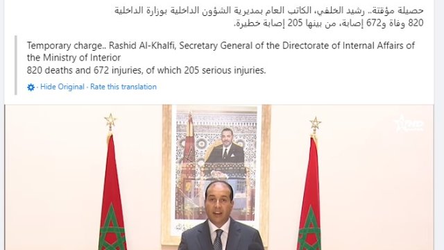 Fas devlet televizyonuna açıklama yapan İçişleri Bakanlığı’na bağlı İç İşleri Genel Sekreteri Rashid Al-Khalfi, meydana gelen 6.8 büyüklüğündeki deprem sonrasında hayatını kaybedenlerin sayısının 820'ye yükseldiğini duyurdu. Genel Sekreter Al-Khalfi, yaralıların sayısını 205’i ağır olmak üzere 672 olarak belirtti.