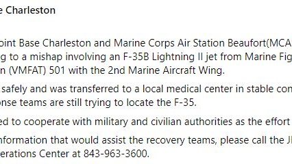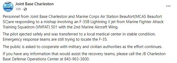 Charleston Hava Kuvvetleri Üssü’nden yapılan açıklamada, “Charleston Hava Kuvvetleri Üssü ve Beaufort Deniz Piyadeleri Hava İstasyonu (MCAS Beaufort SC) personeli, F-35B Lightning II jetinin karıştığı bir kazaya müdahale ediyor. Pilot fırlatma koltuğuyla güvenli bir şekilde uçaktan atlamış ve durumu stabil olarak yerel bir tıp merkezine nakledilmiştir. Acil müdahale ekipleri halen F-35'in yerini tespit etmeye çalışmaktadır. Çalışmalar devam ederken halktan askeri ve sivil yetkililerle işbirliği yapmaları istenmektedir. Kurtarma ekiplerine yardımcı olabilecek herhangi bir bilgiye sahipseniz, lütfen JB Charleston Üssü Savunma Operasyonları Merkezini arayın” denildi.