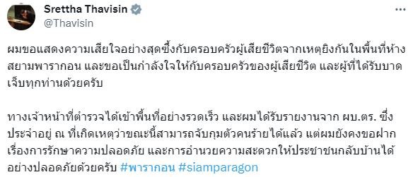 Tayland Başbakanı Srettha Thavisin, sosyal medya hesabından yaptığı açıklamada, “Siam Paragon Alışveriş Merkezi bölgesinde meydana gelen silahlı saldırıda hayatını kaybedenlerin ailelerine en derin taziyelerimi sunuyorum. Ölenlerin ailelerine ve yaralananlara da desteğimi sunmak isterim. Polis memurları hızla bölgeye girdi. Olay yerinde görev yapan polis amirinden şüphelinin gözaltına alındığı bilgisini aldım” dedi.
