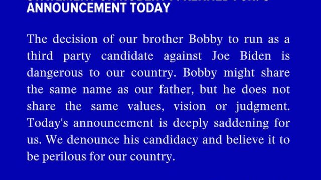 “Bobby babamızla aynı ismi paylaşıyor olabilir, ancak aynı değerleri, vizyonu ya da yargıları paylaşmıyor. Bugünkü açıklama bizim için derin bir üzüntü kaynağıdır. Adaylığını kınıyor ve ülkemiz için tehlikeli olduğuna inanıyoruz.”