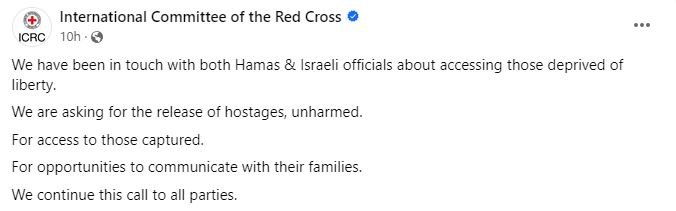 ICRC’den yapılan açıklamada, “Özgürlüklerinden mahrum bırakılanlara erişim konusunda hem Hamas hem de İsrailli yetkililerle temas halindeyiz. Rehinelerin zarar görmeden serbest bırakılmasını istiyoruz. Aileleriyle iletişim kurabilmeleri için fırsat tanınmasını istiyoruz. Tüm taraflara bu çağrımızı sürdürüyoruz” denildi.