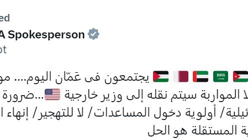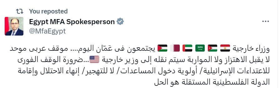 Mısır Dışişleri Bakanlığı Sözcüsü Ahmed Abu Zeid, bugün yaptığı açıklamada “Mısır, Ürdün, Suudi Arabistan, Birleşik Arap Emirlikleri, Katar ve Filistin Dışişleri Bakanları bugün Amman'da buluşuyor... ABD Dışişleri Bakanı'na hiçbir tereddüt ve belirsizliği kabul etmeyen birleşik bir Arap tutumu aktarılacak...