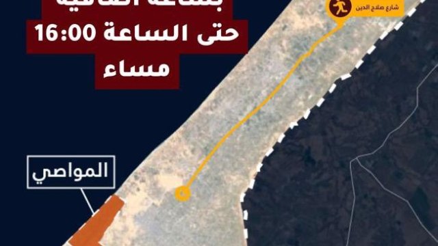 Selahaddin Ekseni üzerinden güneye doğru tahliyeyi teşvik etmek amacıyla bugün saat 10:00-14:00 arasında Cibaliye Mülteci Kampı bölgesinde askeri operasyona taktiksel bir ara verilecek” denildi. İsrailli yetkililer, Gazzelilerin deniz kıyısına gidebileceğini ve oradan aynı kıyı şeridi boyunca güneye inebileceğini vurguladı.