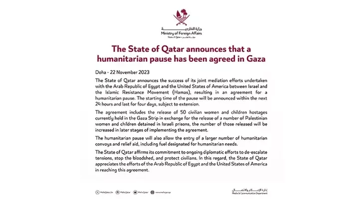 Katar Dışişleri Bakanlığı Sözcüsü Dr. Majed Al Ansari tarafından bugün yapılan yazılı açıklamada “Katar Devleti, İsrail ile İslami Direniş Hareketi (Hamas) arasında Mısır Arap Cumhuriyeti ve ABD ile yürüttüğü ortak arabuluculuk çabalarının başarısını ve insani ara verilmesi konusunda anlaşmaya varıldığını duyurmaktadır” denildi.