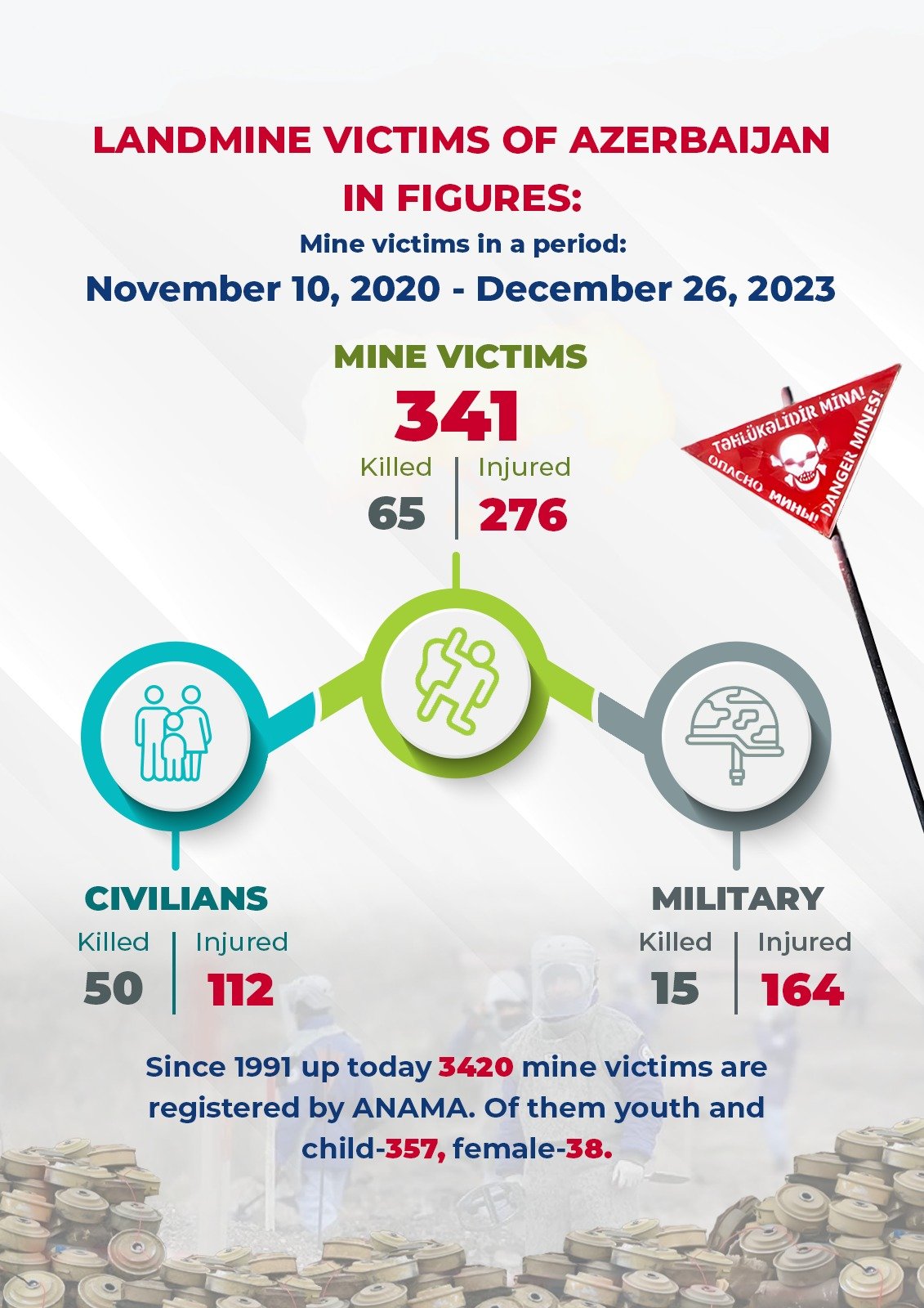 Azerbaycan Dışişleri Bakanlığı, 10 Kasım 2020 ile 26 Aralık 2023 tarihleri arasında toplamda 65 kişinin Ermenistan tarafından döşenen kara mayını sebebiyle öldüğünü 276 kişinin ise yaralandığını açıkladı. Bakanlık açıklamasında 65 kişiden 50’sinin sivil, 15’inin ise ordu mensubu olduğunun altını çizdi.
