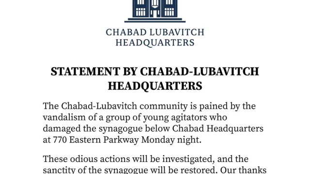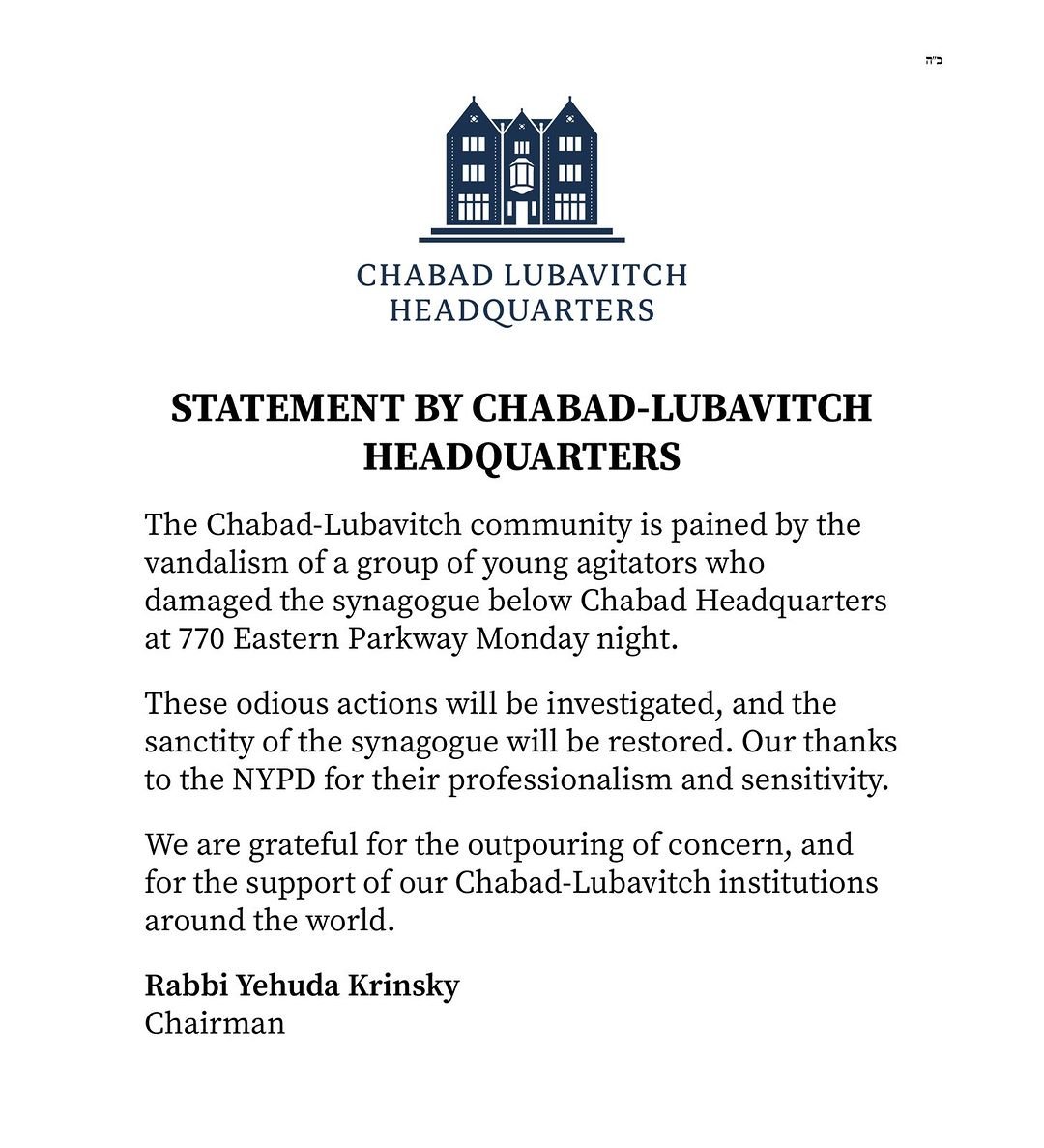 Sinangogunda bulunduğu binayı genel merkez olarak kullanan Chabad-Lubavitch Hasidik Yahudi topluluğunun lideri Haham Yehuda Krinsky, olayla ilgili dün yazılı açıklama yaptı. Haham Krinsky açıklamasında “Chabad-Lubavitch topluluğu, Pazartesi gecesi 770 Eastern Parkway'deki Chabad Genel Merkezi'nin altındaki sinagoga zarar veren bir grup genç ajitatörün vandalizminden dolayı üzüntü duyuyor. Bu iğrenç eylemler araştırılacak ve sinagogun kutsallığı yeniden sağlanacak. NYPD'ye profesyonellikleri ve hassasiyetleri için teşekkür ederiz” ifadelerini kullandı.
